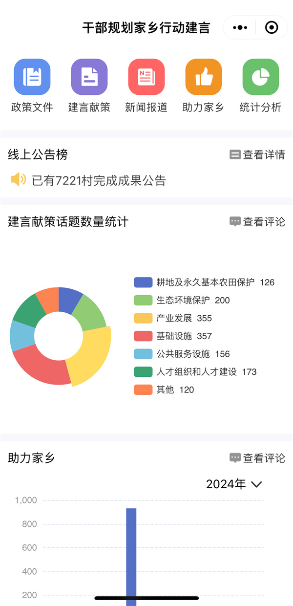 记者打开该微信小程序后看到,“政策文件”功能可以查阅包括《云南省“多规合一”实用性村庄规划编制指南(修订版)》(修订版内容解读)等相关资料。利用“建言献策”功能可针对耕地及永久基本农田保护、生态环境保护等多个话题发表自己的意见建议。“新闻报道”模块则收集汇总了各级各地媒体关于干部规划家乡优秀典型案例以及先进工作经验的报道。而在“助力家乡”这一模块中,大家不仅可以查看全省各行政村的规划图件和村规民约,还可以留言发表对家乡规划和发展的意见建议。